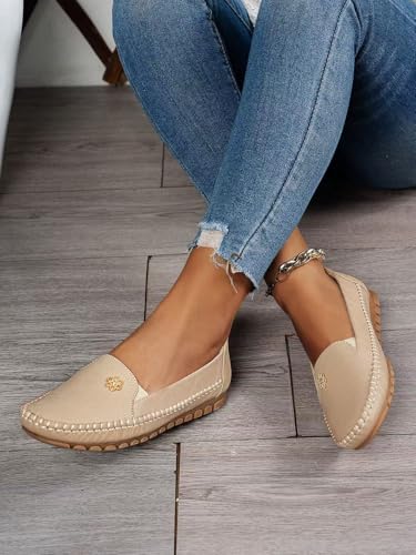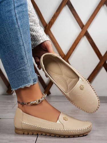 Women's Orthopedic Leather Loafers, Beige Slip-On Flats, Casual Comfort Walking Shoes with Barefoot Feel, Anti-Slip Rubber Sole, PU Upper