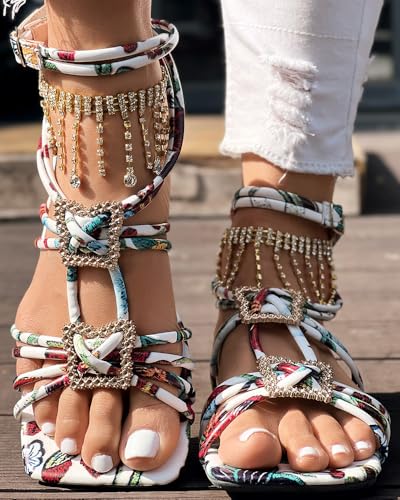 Womens Square Toe Flat Sandals for Women Pink Strappy Rhinestone Sandals Summer Trendy Party Shoes